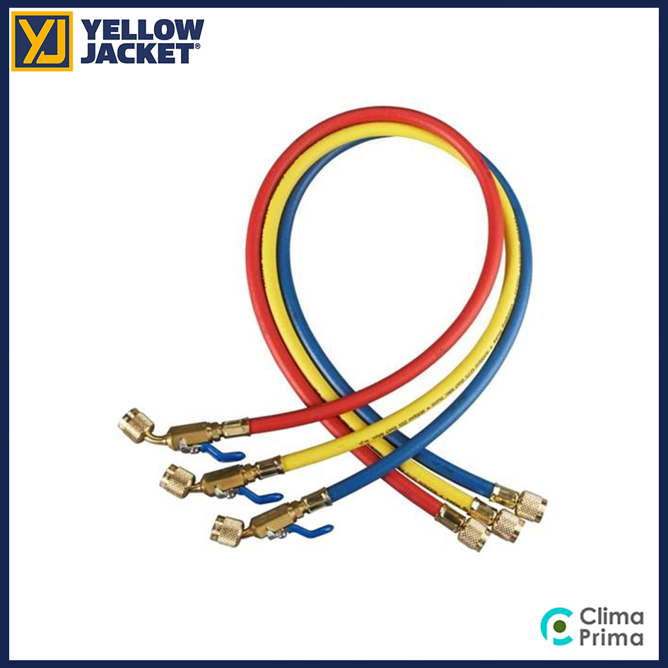 Deze robuuste 3-delige slangenset van Yellow Jacket is ontworpen voor professioneel gebruik in koeltechniek en HVAC-toepassingen. De set bestaat uit drie kleurgecodeerde PLUS II serviceleidingen (rood, geel, blauw) met compacte HBVV-60 kogelafsluiters, die zorgen voor een veilige en efficiënte bediening bij vacuümeren, vullen en testen van koelinstallaties.